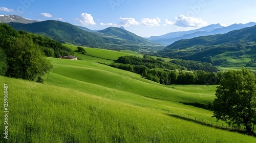 Fototapeta premium Serene Green Landscape with Rolling Hills and Blue Sky in a Picturesque...