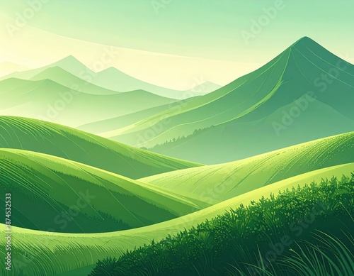 © Kitta Studio, Obraz premium Serene Green Landscape with Rolling Hills and Mountains in Background