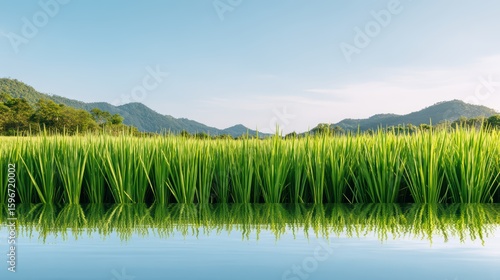 Fototapeta premium Serene Green Rice Field Reflection in Calm Water Body