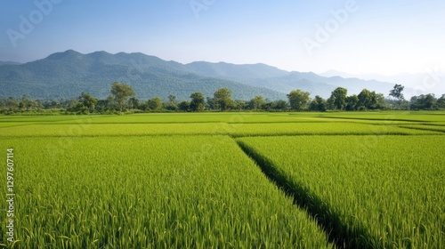 © Ari, Naklejka premium Serene Green Rice Paddy Fields with Mountain backdrop