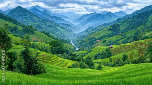 Obraz premium Serene Green Rice Terraces and Valley Landscape