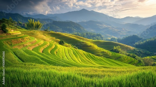 © 69, Fototapeta premium Serene Green Rice Terraces with Majestic Mountains