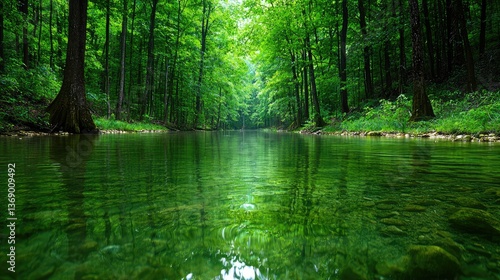 © MUMTAZ, Fototapeta premium Serene Green River Flowing Through Lush Forest