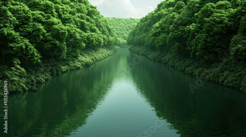 Fototapeta premium Serene Green River Surrounded by Lush Foliage: A Tranquil Escape into...