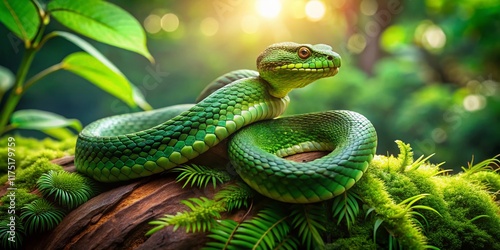 © Man888, Obraz premium Serene Green Snake Coiled on Mossy Log in Tranquil Forest Habitat - Urban Exploration Photography