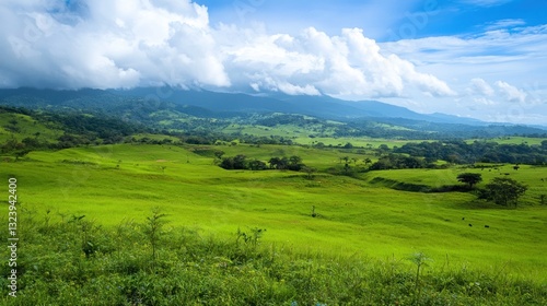 © wulan, Obraz premium Serene Green Valley Landscape with Distant Mountains under a Blue Sky