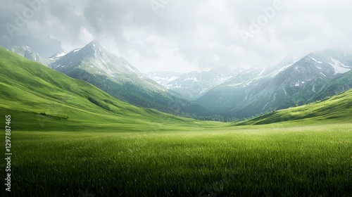 Fototapeta premium Serene Green Valley Landscape with Mountain Range Under Cloudy Sky