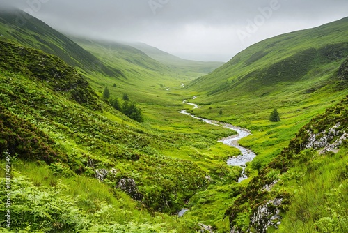© Adi, Naklejka premium Serene Green Valley with Meandering River and Misty Hills