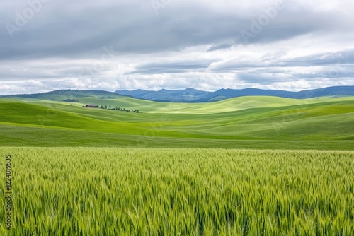 Fototapeta premium Serene Green Wheat Field in Rolling Hills Under a Cloudy Sky