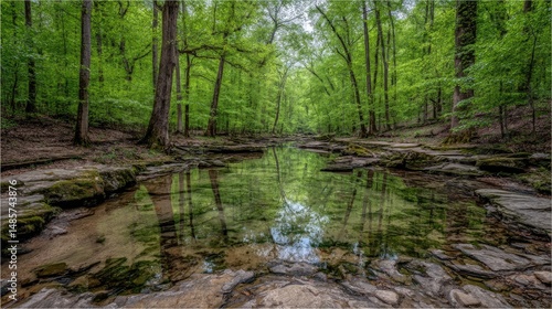Fototapeta premium Serene Green Woodland Stream Reflecting Sky Above