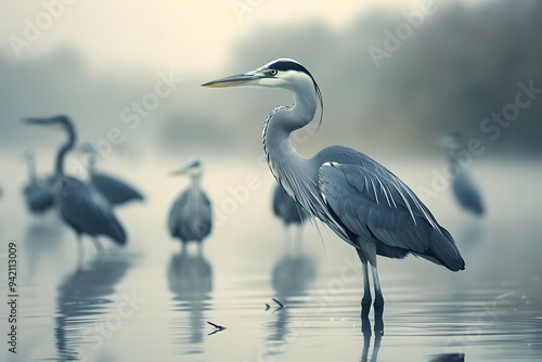 Naklejka premium Serene Herons in a Misty Wetland Landscape