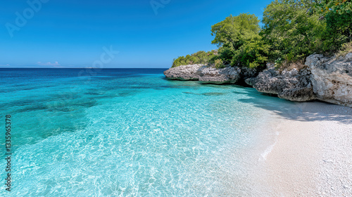 Fototapeta premium serene hidden cove on remote island with clear turquoise waters and sandy shore