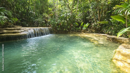 © Jakkarin, Naklejka premium Serene Hidden Waterfall in Unseen Thailand Surrounded by Lush Foliage and Orchids, Ultra Detailed Shot of Crystal-Clear Turquoise Pool