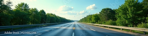 Fototapeta premium Serene highway under blue sky with trees on either side, bridge, highway,...