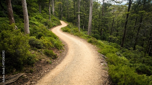 © 2D_Jungle, Naklejka premium Serene Hiking Trail in Tasmania's Wilderness: A Journey Through Majestic Forests