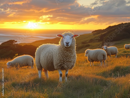 © Sarocha, Fototapeta premium Serene Hillside with Grazing Sheep at Sunset