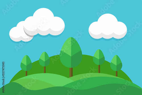 © Sharati, Obraz premium Serene Hilltop Landscape Green Hills, Lush Trees, and Fluffy Clouds