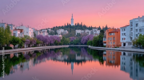 © Baginda, Fototapeta premium Serene hilltop temple overlooks a tranquil lake reflecting vibrant pink and purple twilight sky amidst blooming trees and modern architecture a picturesque urban landscape