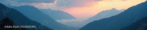 Obraz premium Serene Himalayan valley at dawn with misty mountains and a cloudy sky, cloudy sky, landscape