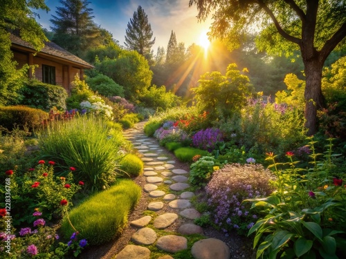 © Four888, Obraz premium Serene Home Garden Stone Pathway, Lush Greenery, Sunlight, Peaceful Landscape