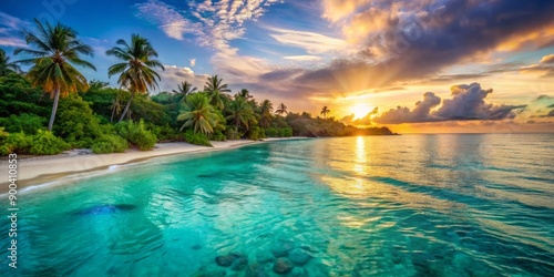 Fototapeta premium Serene horizon meets turquoise sea water surface, warm light illuminates a tranquil tropical island paradise beach at sunrise, perfect for summer vacation backgrounds.