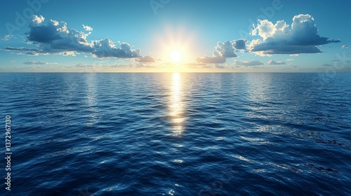 Fototapeta premium Serene Horizon with Subtle Sun Flare and Bokeh over Tranquil Ocean Surface at...