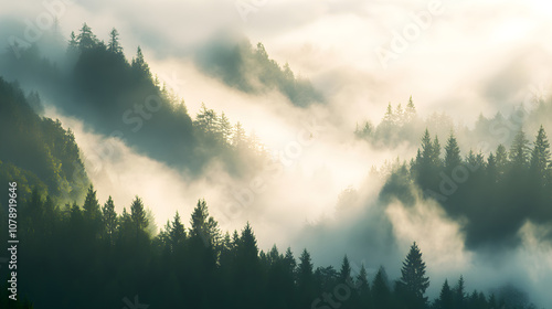 Fototapeta premium Serene image of morning fog rolling over a dense forest, creating a mystical atmosphere with soft light filtering through the trees
