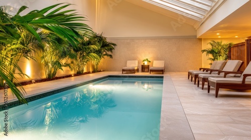 Obraz premium Serene indoor pool area with lounge chairs and lush greenery, creating a...