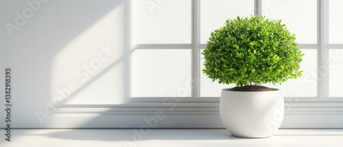 © Sarinya, Fototapeta premium Serene indoor scene featuring a vibrant green topiary in a white pot against a bright window light evoking calm and natural freshness