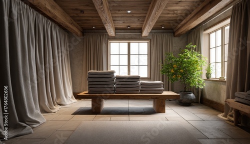 Obraz premium Serene indoor scene with wooden beams, draped curtains, stacked towels, and...