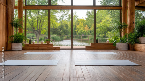 © siraphol, Obraz premium serene indoor yoga space with mats overlooking peaceful lake view