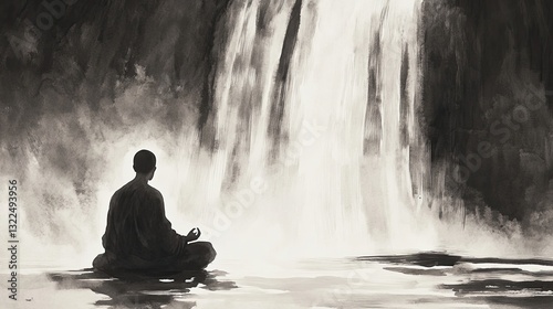 © SepazWorks, Obraz premium Serene Ink Wash of a Monk Meditating Beneath a Waterfall