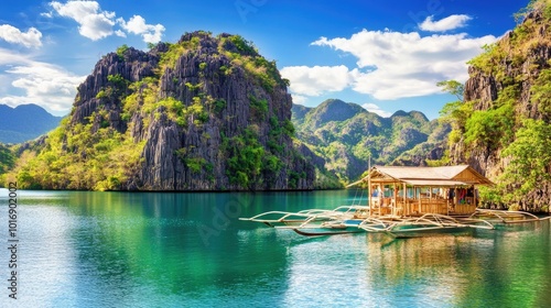 © Sampao, Naklejka premium Serene Island Landscape with Boat in Tropical Water