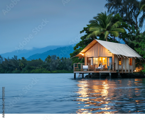 Naklejka premium Serene Island Retreat: A Petite Canvas Bungalow Under Twilight