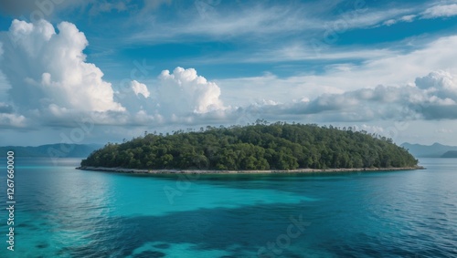 © Seyyar, Fototapeta premium Serene Island Surrounded By Clear Blue Water Under A Cloudy Sky With Space For Your Text And Creative Ideas