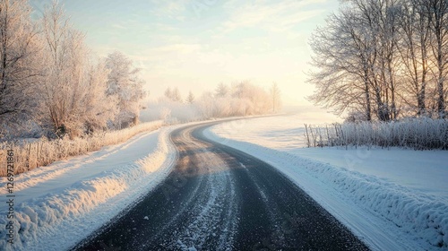 © Kitta Studio, Fototapeta premium Serene Isolated Asphalt Path Cutting Through Snowy Landscape