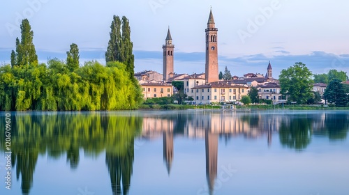© Thanapon, Fototapeta premium Serene Italian Lakeside Town with Twin Towers at Dawn Scenic Reflection