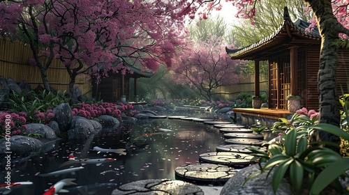 © pixelstoock, Obraz premium Serene Japanese Garden Background with Cherry Blossoms and Koi Pond