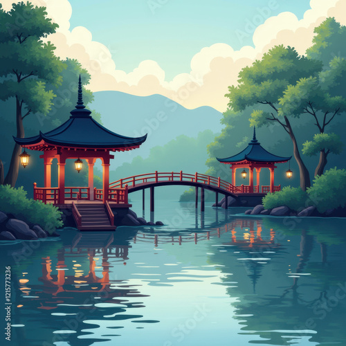Naklejka premium Serene Japanese Garden, Pagoda Bridge - Zen/Minimalist design