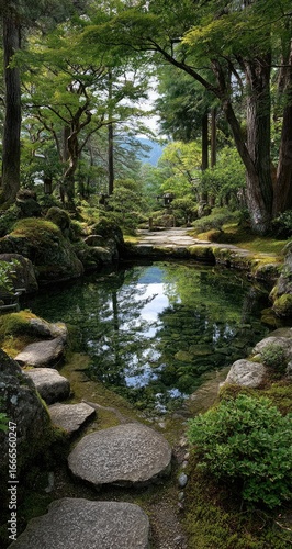 © Cahyo, Fototapeta premium Serene Japanese garden path, reflecting sky