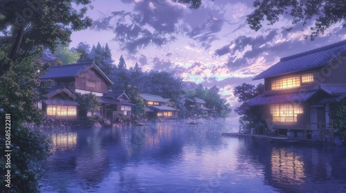 Fototapeta premium Serene Japanese Lakeside Retreat at Dusk with Soft Colors