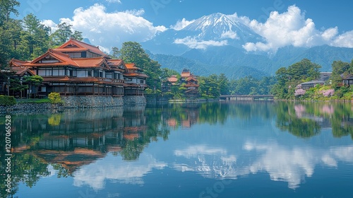 © Siti, Fototapeta premium Serene Japanese Lakeside Village with Majestic Mountain View