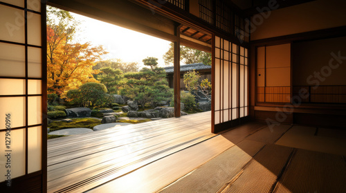 © vachiraphan, Obraz premium serene Japanese style room with garden view