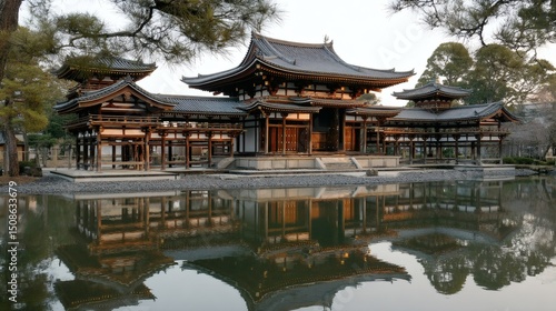 Fototapeta premium Serene Japanese Temple Reflected in Calm Water at Sunrise