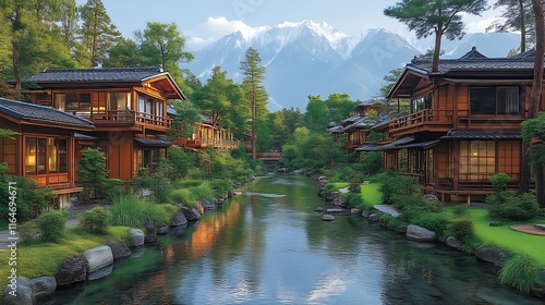 Fototapeta premium Serene Japanese Village nestled beside a tranquil river and mountains