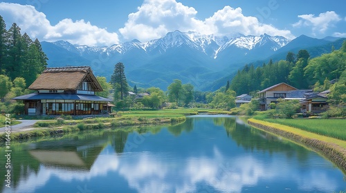Naklejka premium Serene Japanese Village nestled beside a tranquil waterway and majestic mountains
