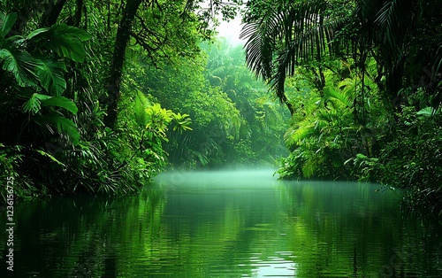 © azka, Obraz premium Serene jungle river scene with mist, lush vegetation, and calm water.