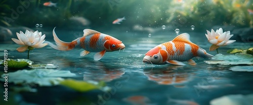 © AIFusion, Fototapeta premium Serene Koi Pond Two Orange and White Koi Fish Swimming Amongst Water Lilies