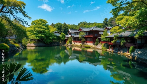 © Sanook, Fototapeta premium Serene Kyoto river scene, tranquil waters reflecting lush greenery, environment, stillness