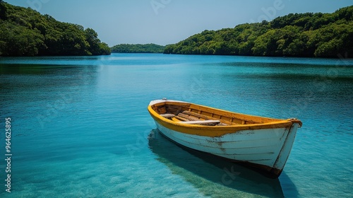 © Rizky, Fototapeta premium Serene Lagoon with a Rowboat